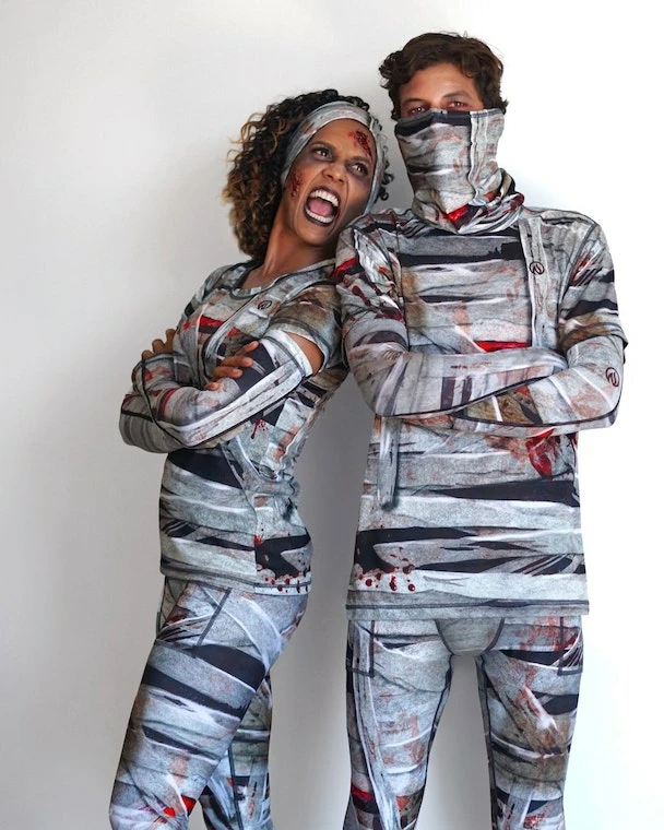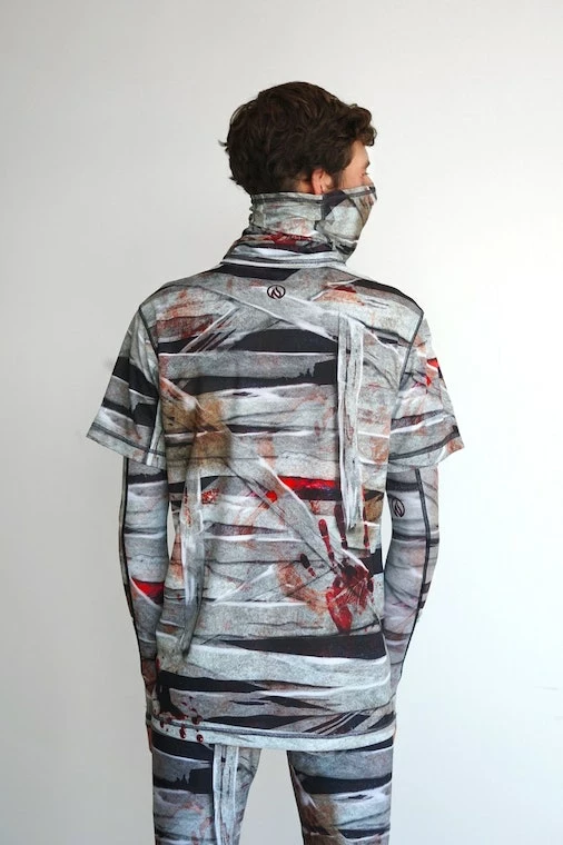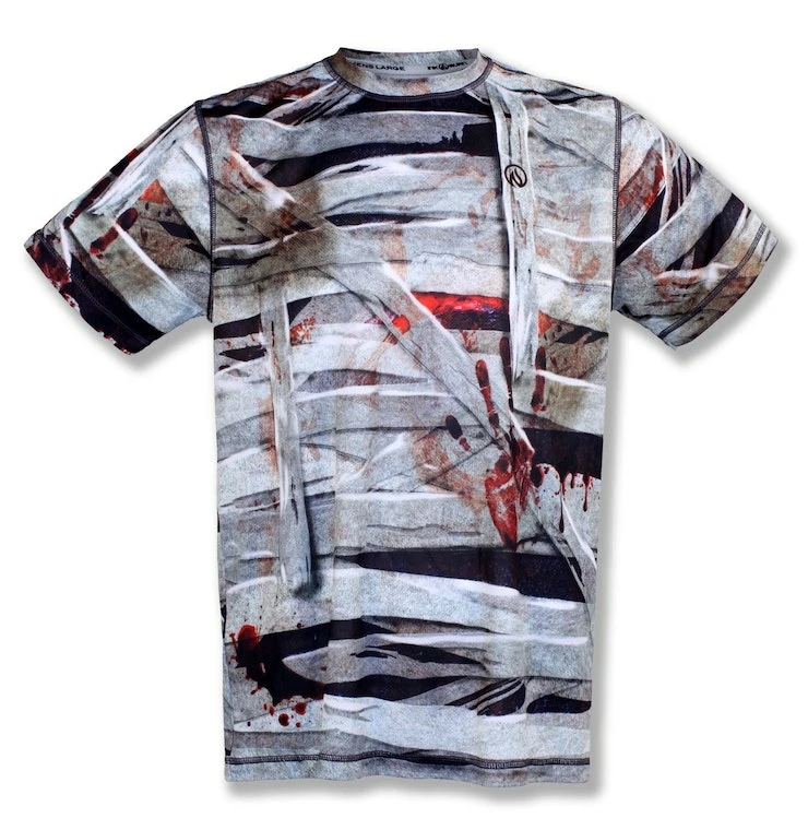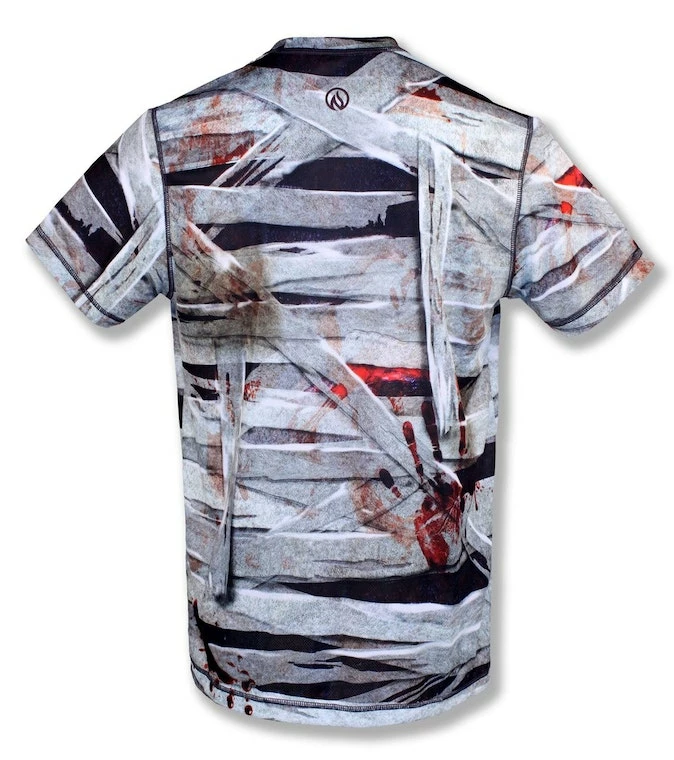 The INKnBURN Men’s Mummy Tech Shirt is the most functional mummy wear you’ll ever encounter. Since it is all art, you won’t be tripping over gauzy bandages or have any organs slipping out during your run. A great look to turn some heads and have a scary good time! Be sure to get the Tech Tube, Headband, Sleeves and Tights to get the whole effect! All made with our Dry I.C.E. Fabrics to keep you cool and comfortable while you shock and frighten your friends, family and spectators at your next race!