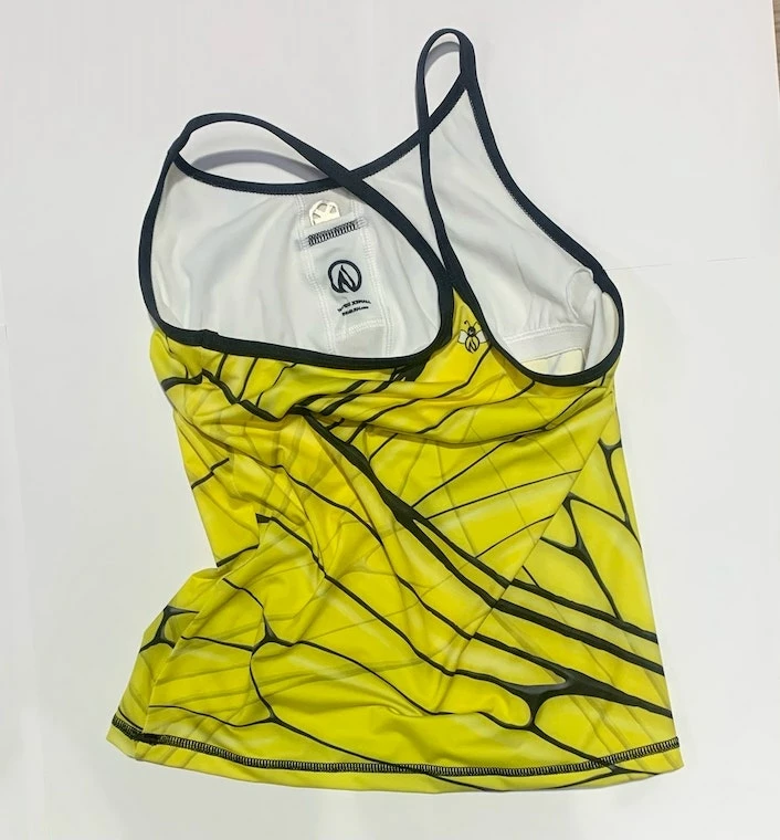 This Women’s Bee Camisole is a lusciously layered design featuring black and yellow bee wings. Sweeping lines that wrap around you in a flattering and organic rhythm. This design celebrates a tiny and delicate superhero that defies physics every day to keep the world fed! The camisole features a built in shelf bra, key pocket and pockets for modesty pads. It is great to slip on one top and be out the door for your workout, run, race or zoom meeting. Its Silky Dry I.C.E. Fabric will wick away moisture, won’t show sweat and get you excited to workout! Made with such great quality, we have many customers still wearing their camis they bought 8 years ago!