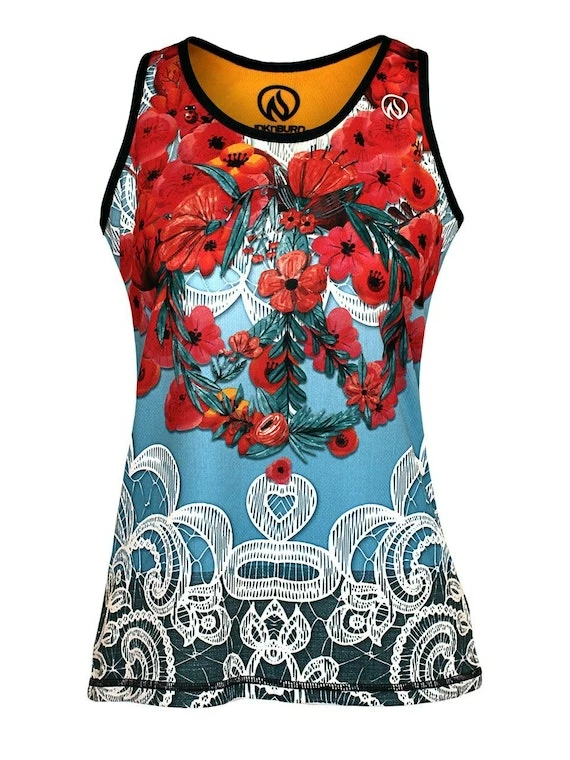 This INKnBURN Women’s Boho Singlet features poppies to symbolize finding your inner peace, a peace symbol to share the love with all you see and even a hidden lady bug for good luck! A beautifully vibrant, energetic and feminine design.This light-weight, race-cut singlet is designed for speed, but also works well as a cool, kick-back summer top that won’t show sweat! Vibrant art you can’t feel, on our super-light, moisture-wicking Dry I.C.E. Fabric. 100-Mile tested by ultra runners for comfort at extreme distance and a unique, head-turning design.