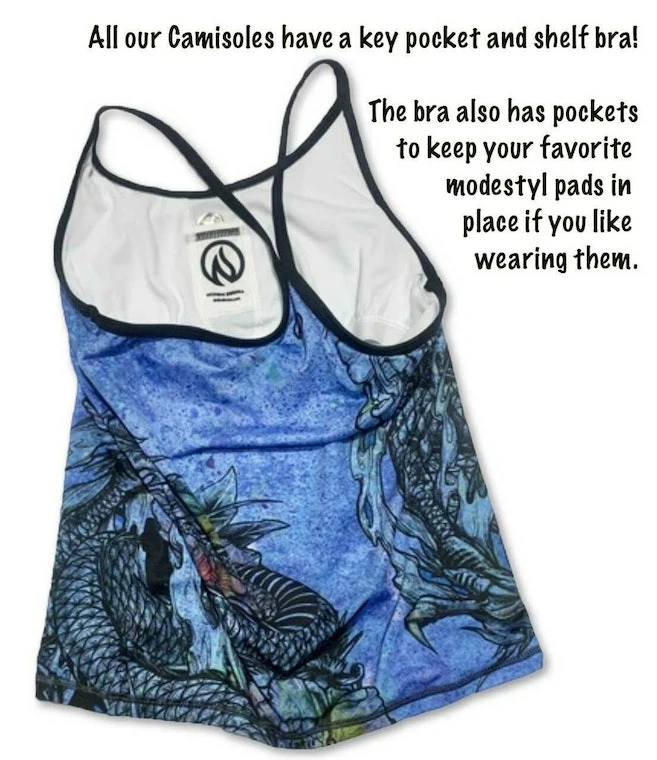 Calavera, considered the “mischievous dead”, is one of the most beloved symbols of Dia de los Muertos, (Day of the Dead). But, these vibrant and ornate skulls are not presented to terrorize. Instead, they represent the playfulness of the dead, as they mimic the living and frolic amongst us… reminding us not to take ourselves too seriously. The Calavera Camisole features a built in shelf bra, key pocket and pockets for modesty pads. It is great to slip on one top and be out the door for your workout, run, race or zoom meeting. Its Silky Dry I.C.E. Fabric will wick away moisture, won’t show sweat and get you excited to workout! Made with such great quality, we have many customers still wearing their camis they bought 8 years ago!