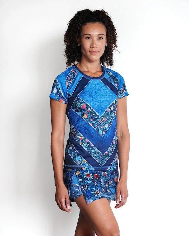 This Women’s Ladybug Tech Shirt features an adorable symbol of luck that you have to look closely to find! We created a floral design with the center of each flower featuring a different Japanese fabric pattern then hand-placed each flower. There are just a few ladybugs hidden among the flowers that fill up the form-flattering chevrons. Made with INKnBURN’s proprietary Dry I.C.E. Fabric, this top is light, cool and so comfortable you will want to workout more just so you can wear it!