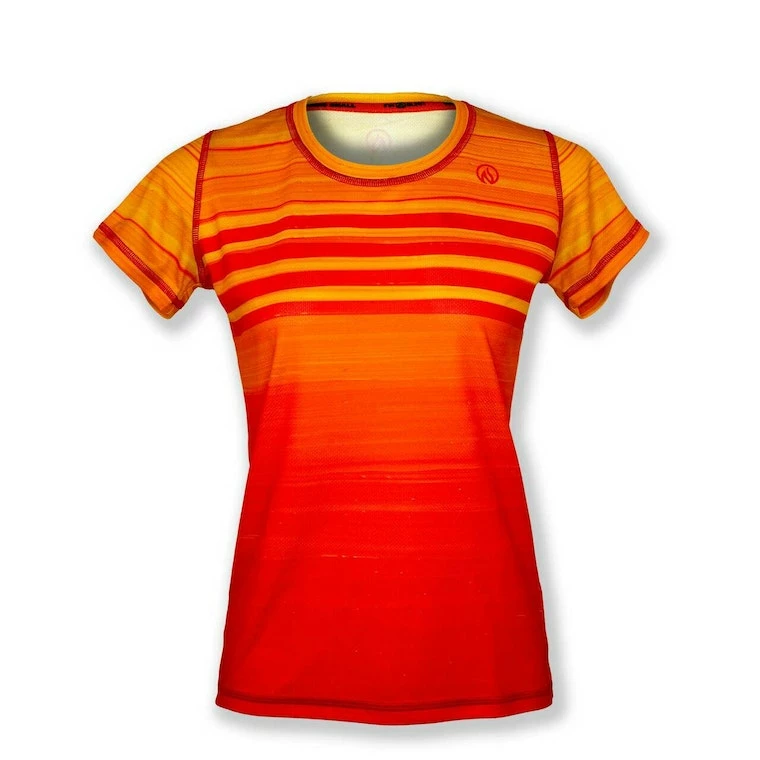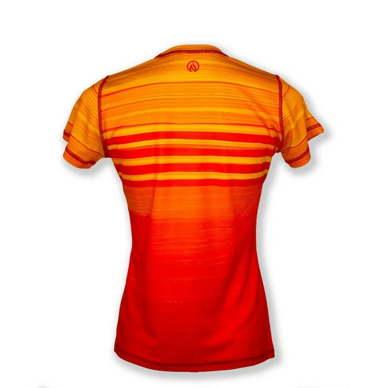 The INKnBURN Women’s Mango Tech Shirt features delicious shades of orange and orange-red that look painted on the fabric. A bright and colorful neutral that will go with many other items in your wardrobe. This design has high visibility color to make you easily seen! This light-weight, tech shirt is designed for speed, but also works well as a cool, kick-back top that won’t show sweat! INKnBURN apparel doesn’t fade, so this tech will look great years from now! Vibrant art you can’t feel, on our super-light, moisture-wicking Dry I.C.E. Fabric. 100-Mile tested by ultra runners for comfort at extreme distance and a unique, head-turning design.