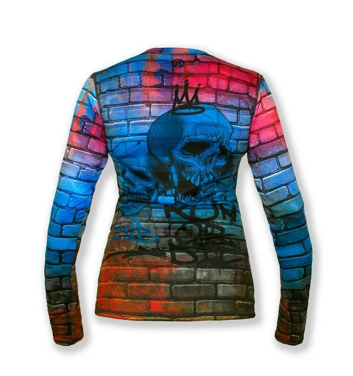 Graffiti, skulls and Run or Dieâ„¢ on a brick wall… what more do you need to know? Make this top yours! If you haven’t tried an INKnBURN pullover before, you are in for a treat! They feel velvety soft on the inside, smooth and silky on the outside. The brushed interior keeps warmth in, while still wicking away moisture and letting air circulate through. The longer sleeves with thumbholes give you the option of pulling them down over your hands for extra warmth.