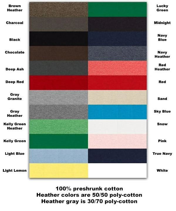 | Color and T-Shirt Size | Black / S – $15.50, Black / M – $15.50, Black / L – $15.50, Black / XL – $15.99, Brown / S – $15.50, Brown / M – $15.50, Brown / L – $15.50, Brown / XL – $15.99, Charcoal / S – $15.50, Charcoal / M – $15.50, Charcoal / L – $15.50, Charcoal / XL – $15.99, Green / S – $15.50, Green / M – $15.50, Green / L – $15.50, Green / XL – $15.99, Light Blue / S – $15.50, Light Blue / M – $15.50, Light Blue / L – $15.50, Light Blue / XL – $15.99, Navy Blue / S – $15.50, Navy Blue / M – $15.50, Navy Blue / L – $15.50, Navy Blue / XL – $15.99, Red / S – $15.50, Red / M – $15.50, Red / L – $15.50, Red / XL – $15.99 |