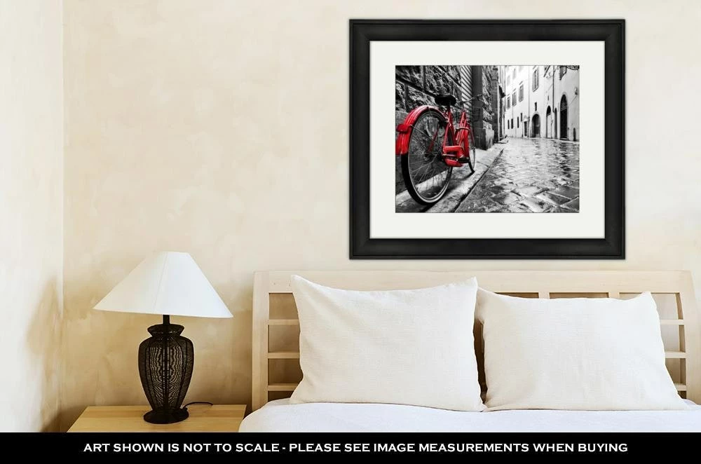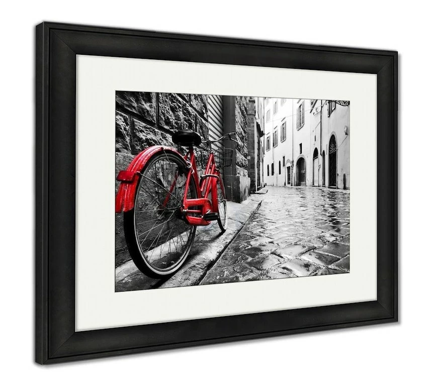 The artist descibes this piece as: Retro vintage red bike on cobblestone street in the old town. Color in black and white. Old charming bicycle concept.