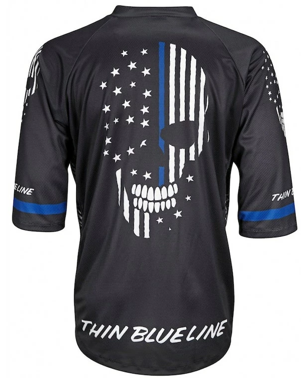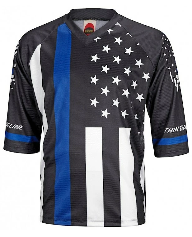 The Thin Blue Line Men’s Mountain Bike Jersey features a 3/4 length sleeve and a loose fitting casual style. The loose fit on this mountain bike jersey provides great mobility while on the trail while still providing ample room for protective gear. The jersey also features a flat V Neck collar which provide a great fit. Like most jerseys this mountain bike jersey is constructed out of dry sport polyester. The breathable lite weight fabric works to wick moisture away from the skin to keep you dry and cool on those hot days out on the trail. The jersey has no elastic on the waist of cuffs and no pockets. Its perfect for use with a hydration pack.